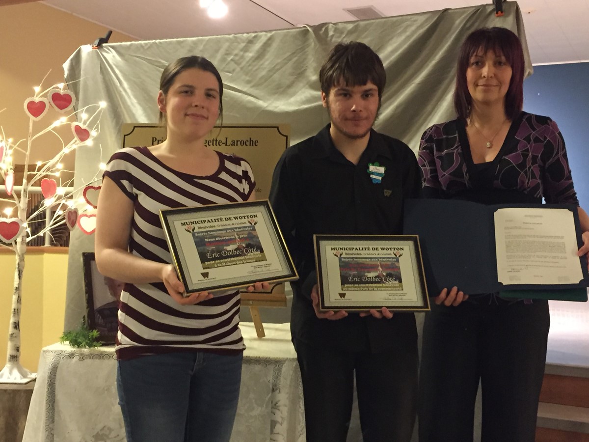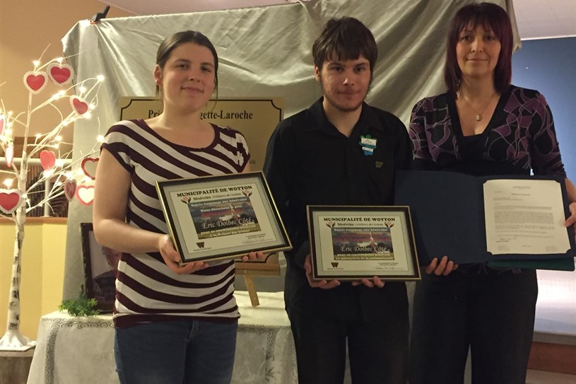 Cette année, ce prix a été remis à un jeune homme qui s’implique activement depuis trois ans, date de son arrivée à Wotton, au sein de la Maison des jeunes, et qui est très présent dans sa communauté. Éric Dolbec-Côté, 16 ans, a été décrit comme «une personne de peu de mots, mais de grands gestes. Il est doté d’une grande générosité envers autrui et il s’épanouit de plus en plus à travers ses activités de bénévolat» par Nancy Bourget, membre du conseil d’administration de la Maison des jeunes de Wotton. Éric devient ainsi le plus jeune bénévole de la communauté à recevoir ce prix.