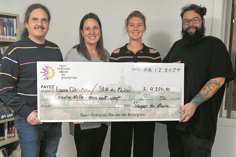 Saint-François-Xavier-de-Brompton — Adam Rousseau, maire de 2021 à 2025, s’est joint à Alexandre Roy, maire de 2025 à 2029, pour remettre les bénéfices de la vente de bière et de saucisses, soit 4 220,50 $, à deux résidents de Saint-François. Ces bénéfices ont été remis à Laura Côté-Collin, une athlète internationale de volley-ball de plage, et à Julie Dubois, une initiatrice de l’enquête de la Direction de la santé publique sur le nombre de cas de sclérose latérale amyotrophique dans la région du Val-Saint-François.