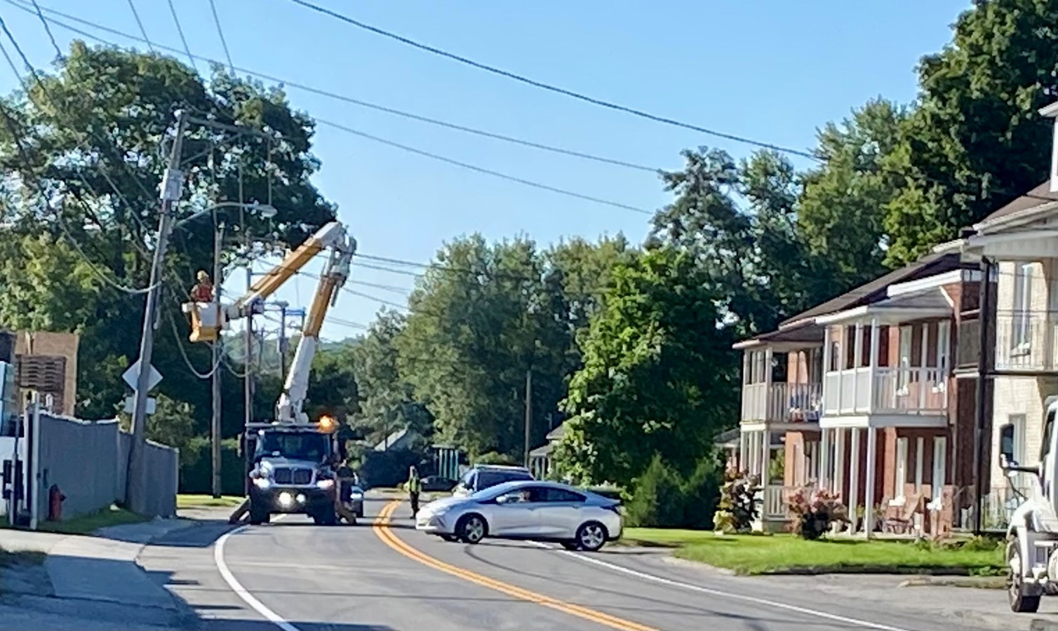 Un fil électrique, qui s’est retrouvé au sol alors qu’il était toujours alimenté en électricité, a forcé la fermeture partielle de la rue et l’intervention des pompiers du Service de sécurité incendie de Windsor ainsi que des techniciens d’Hydro-Québec. La Sûreté du Québec a été appelée en soutien.