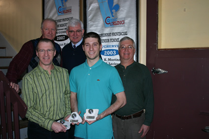 Accompagnés de Jean-Marie Benson, trésorier au sein de l’association régionale de Curling Estrie, Alain Deschâtelets, responsable de Curling Québec et James Mastine, président du Club de curling de Windsor, Marc et Ghyslain Richard tiennent les trois prix Granite remis lors du 6e Gala Méritas de Curling Québec.