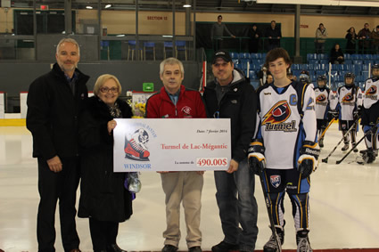 La remise du chèque symbolique au montant de 490 $ à l’équipe du Turmel de Lac Mégantic. Dans l’ordre habituel : le président d’honneur Hugo Brunelle, la mairesse Colette Roy-Laroche, Jean Schinck du National bantam, l’entraîneur du Turmel, Dominic Bédard et le capitaine de l’équipe, Jacob Leblanc.